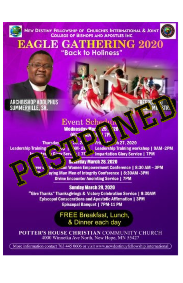 ¡La Conferencia de Eagle Gathering 2020 en New Hope por Potter’s House ha sido pospuesta! ¡Cuando el evento haya sido reprogramado, le informaremos las nuevas fechas!