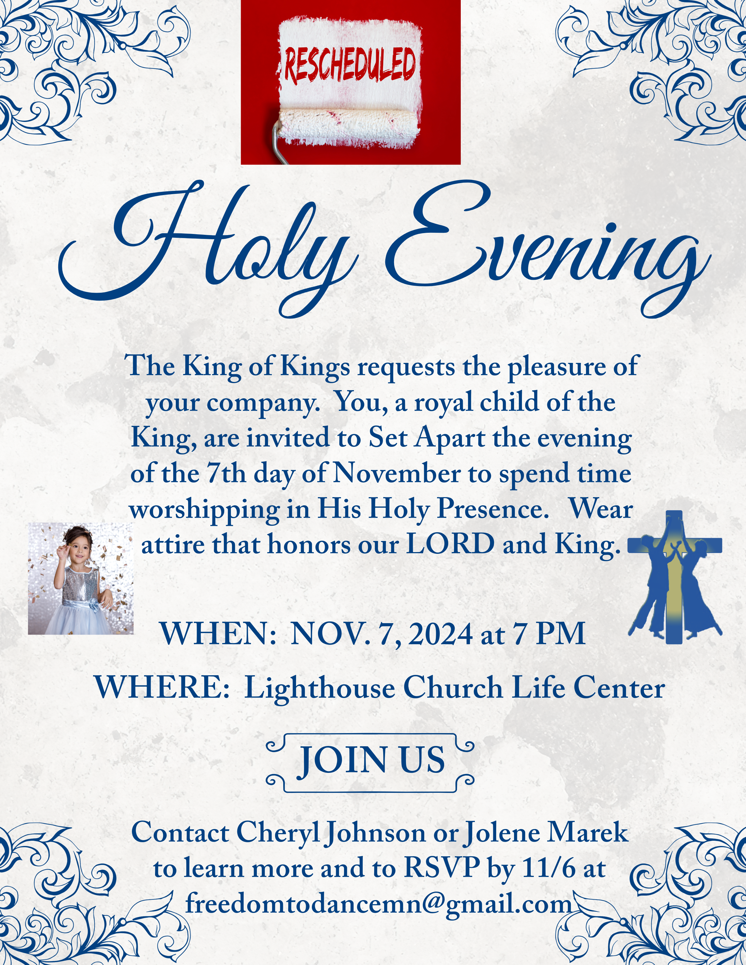 We wanted to give you a heads up that we are invited to minister through Spirit led worship dance during an Art Exhibit at Centennial Lakes Park on either Saturday, May 17th, or Sunday, May 18th. The music has been selected by the organizer to match the theme of Behold God, so we will not know the songs in advance. The art exhibition is an annual event for Christian artists of all kinds to showcase their art. Please set aside these dates to join us in magnifying the LORD!
